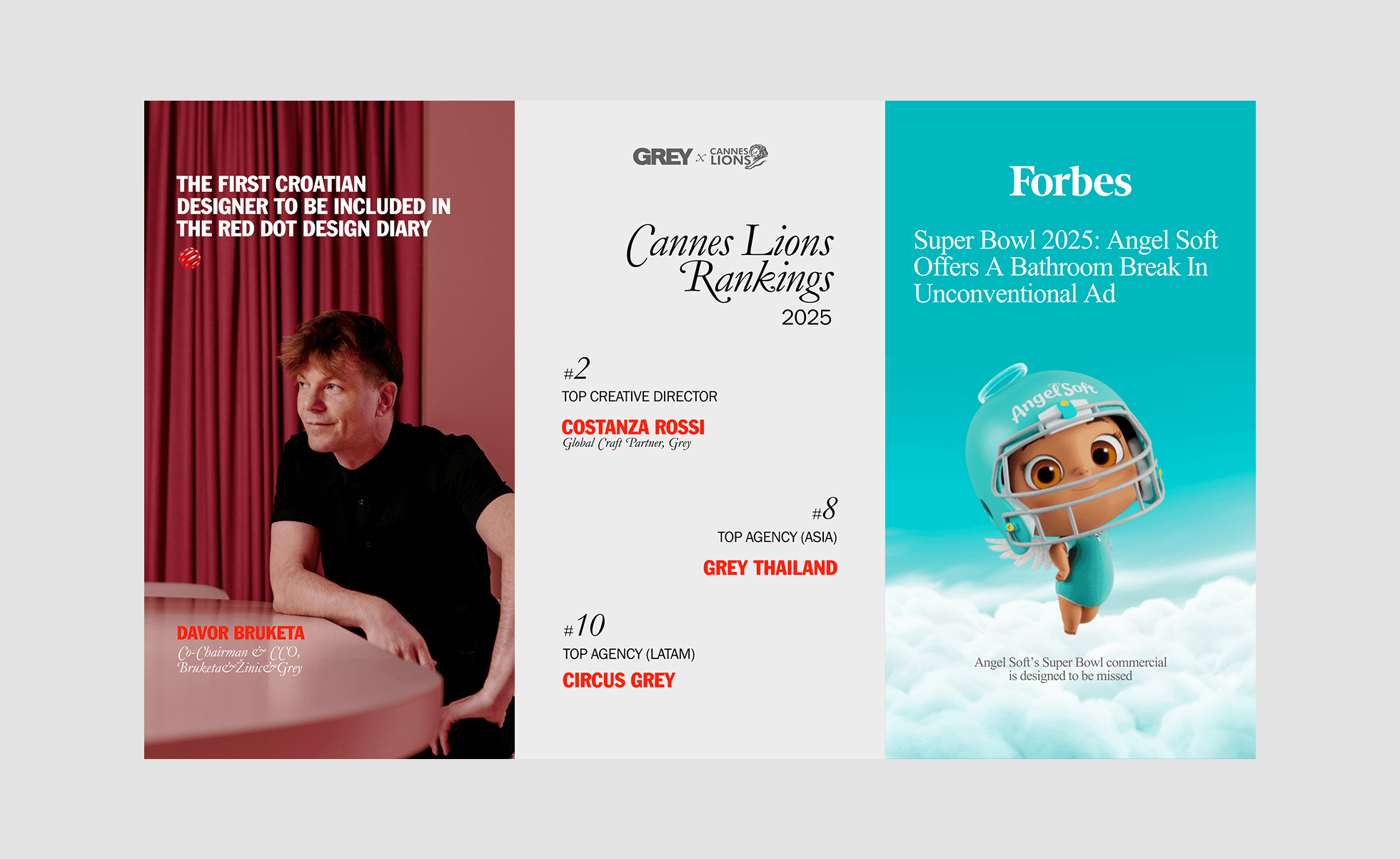 Designed visual assets to share Grey’s latest news, achievements, and campaigns across the agency’s owned social channels and website — maintaining strict brand guidelines while working without external design resources. Used Figma to create layouts, select fonts and colours consistent with Grey’s visual identity, and adapt assets for multiple platforms to ensure optimal presentation and performance.
